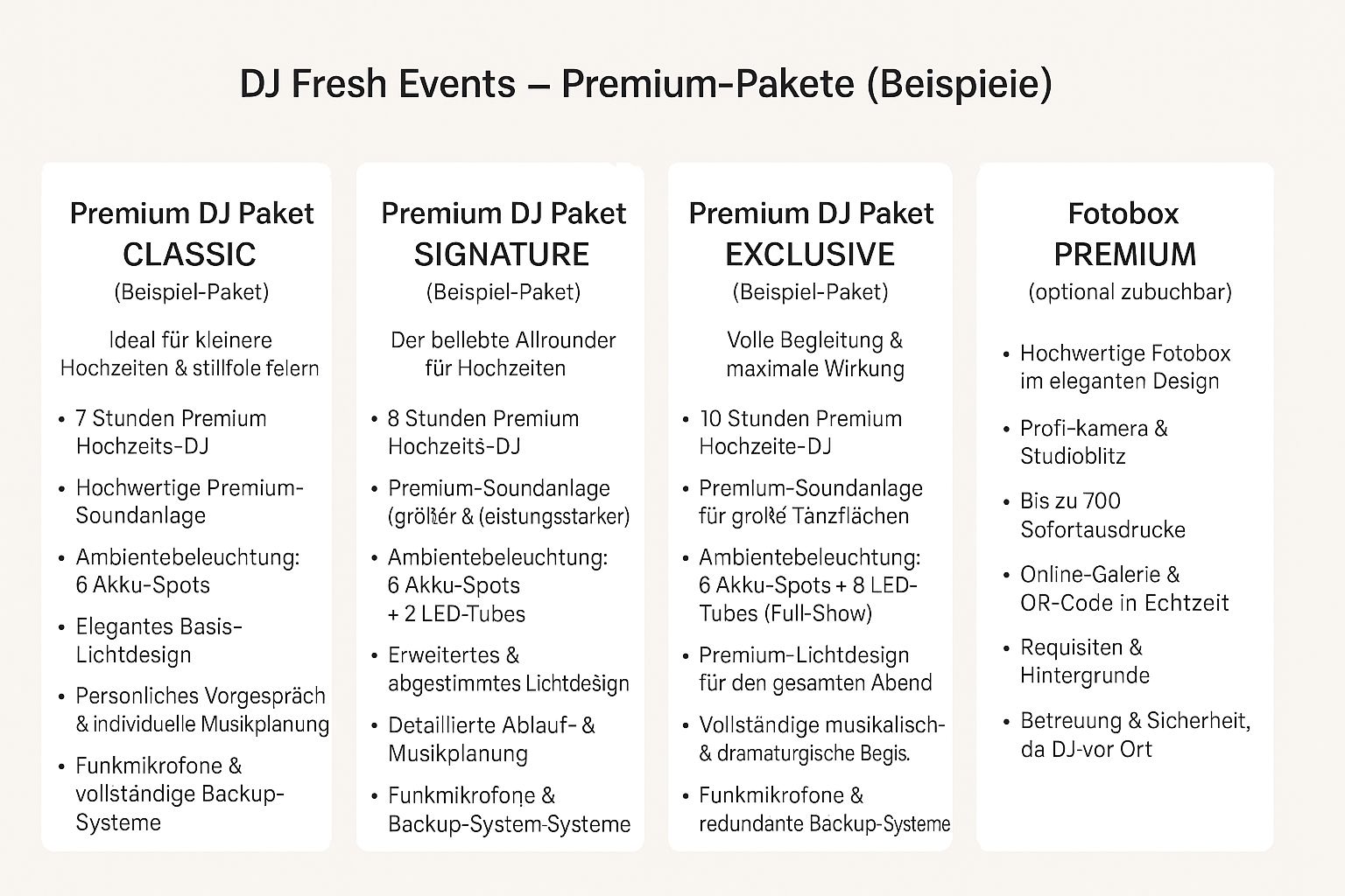 Entdecken Sie unsere Pakete für unvergessliche Events! Von grundlegenden bis hin zu maßgeschneiderten Optionen bieten wir für jeden Anlass das passende Paket. Bitte beachten Sie, dass dies nur Beispiele sind – wir erstellen auch gerne individuelle Angebote nach Ihren Wünschen.